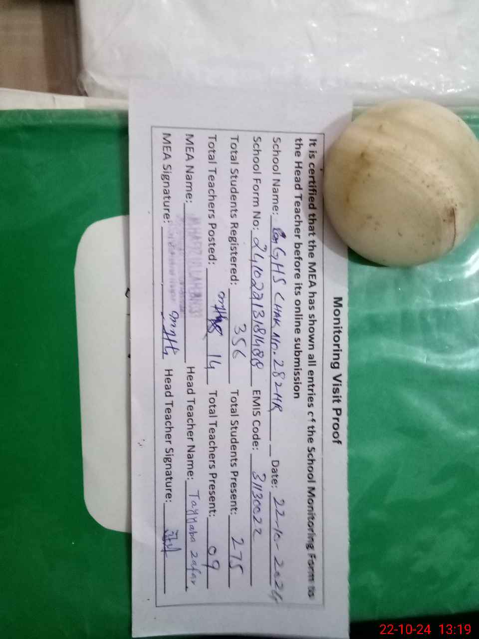 | Attendance Register | Head Teacher | MEA with School | Visit Proof |