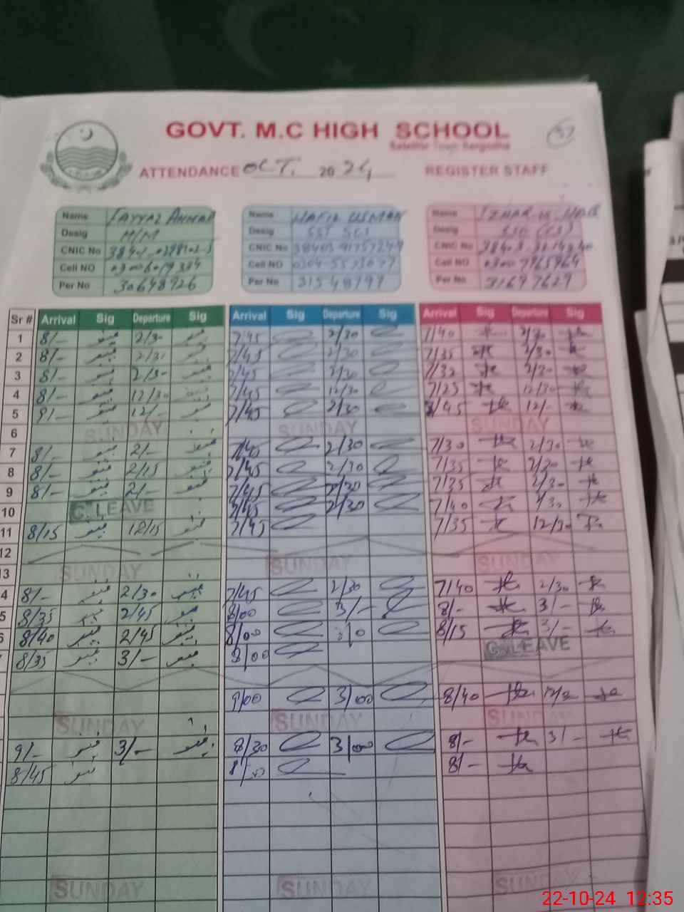 | CNIC | Full Name | Designation | R/C | Absence during last cal. month |