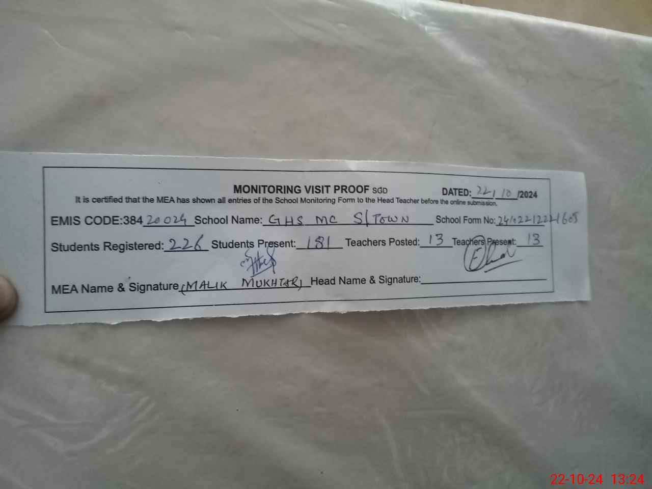 | Certified that this School was Inspected by the Undersigned MEA/DMO Today and the Information Stated Above is as Per Record. | |||||