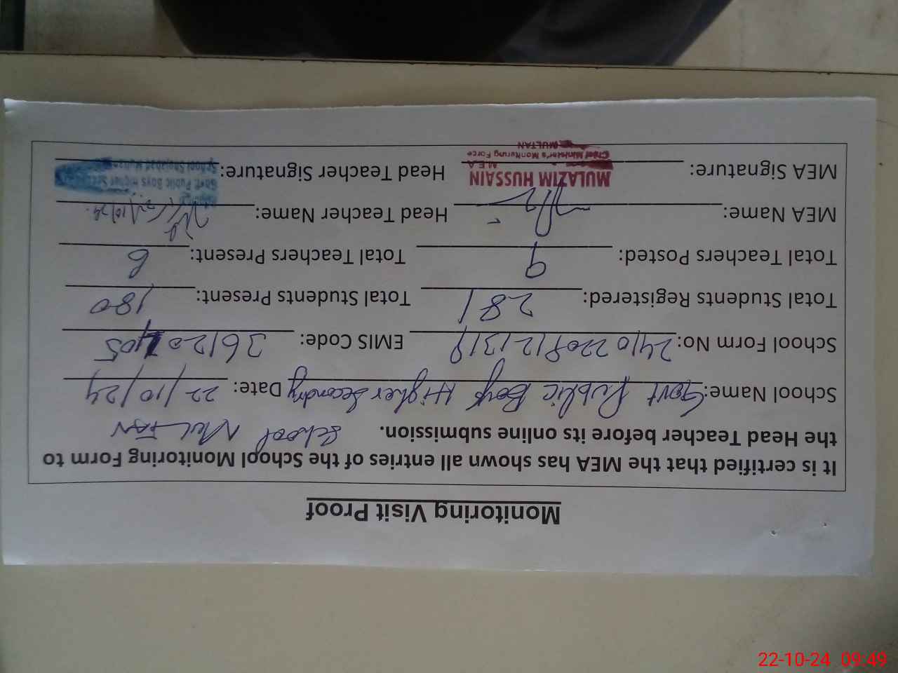 | Certified that this School was Inspected by the Undersigned MEA/DMO Today and the Information Stated Above is as Per Record. | |||||