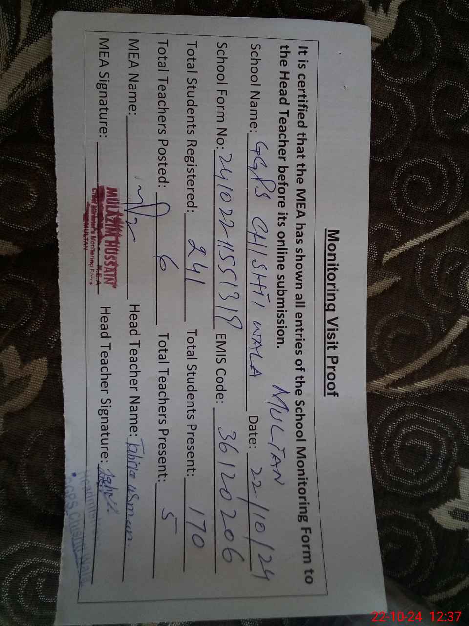 | Certified that this School was Inspected by the Undersigned MEA/DMO Today and the Information Stated Above is as Per Record. | |||||