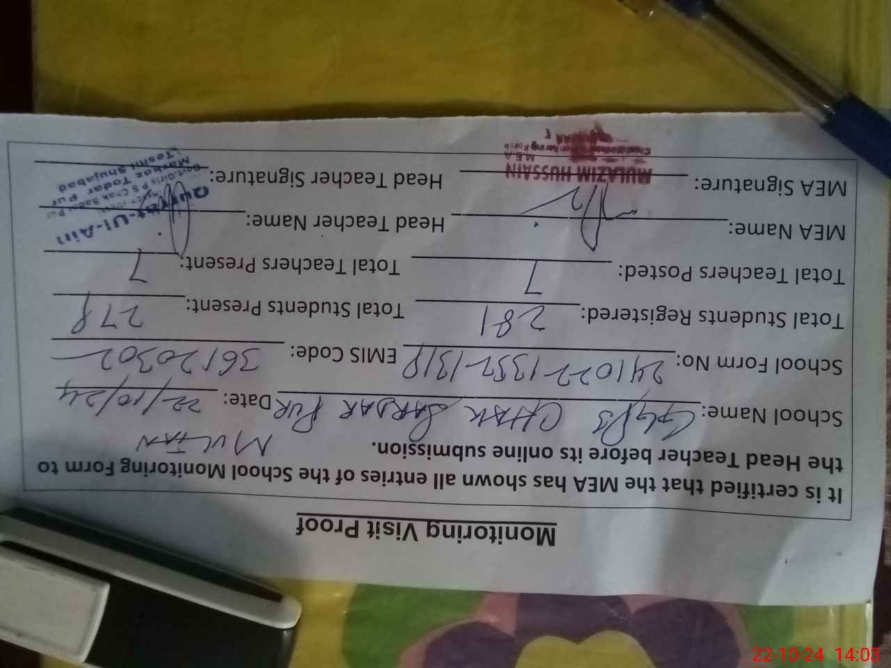 | Certified that this School was Inspected by the Undersigned MEA/DMO Today and the Information Stated Above is as Per Record. | |||||