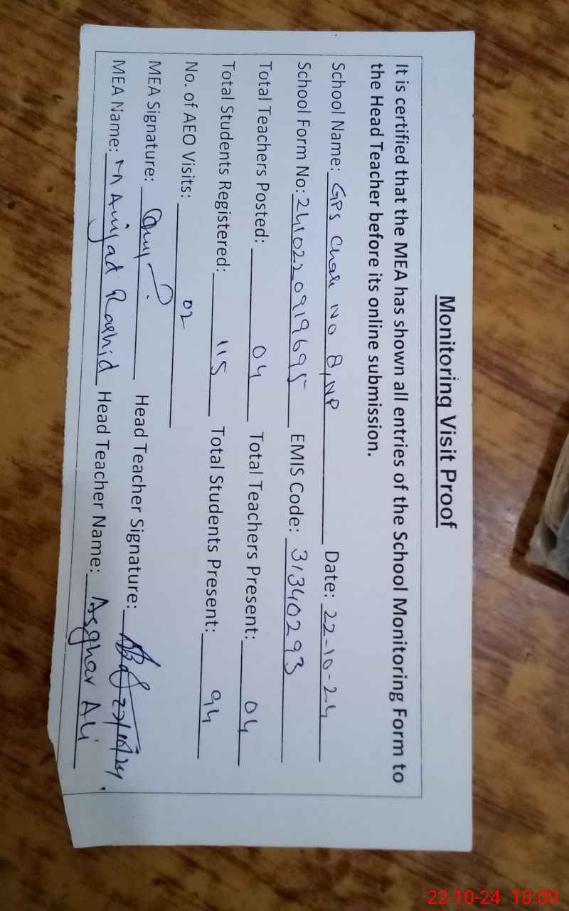 | EMIS Code: 31340293 | Name of School: GPS CHAK NO 8 NP | |||