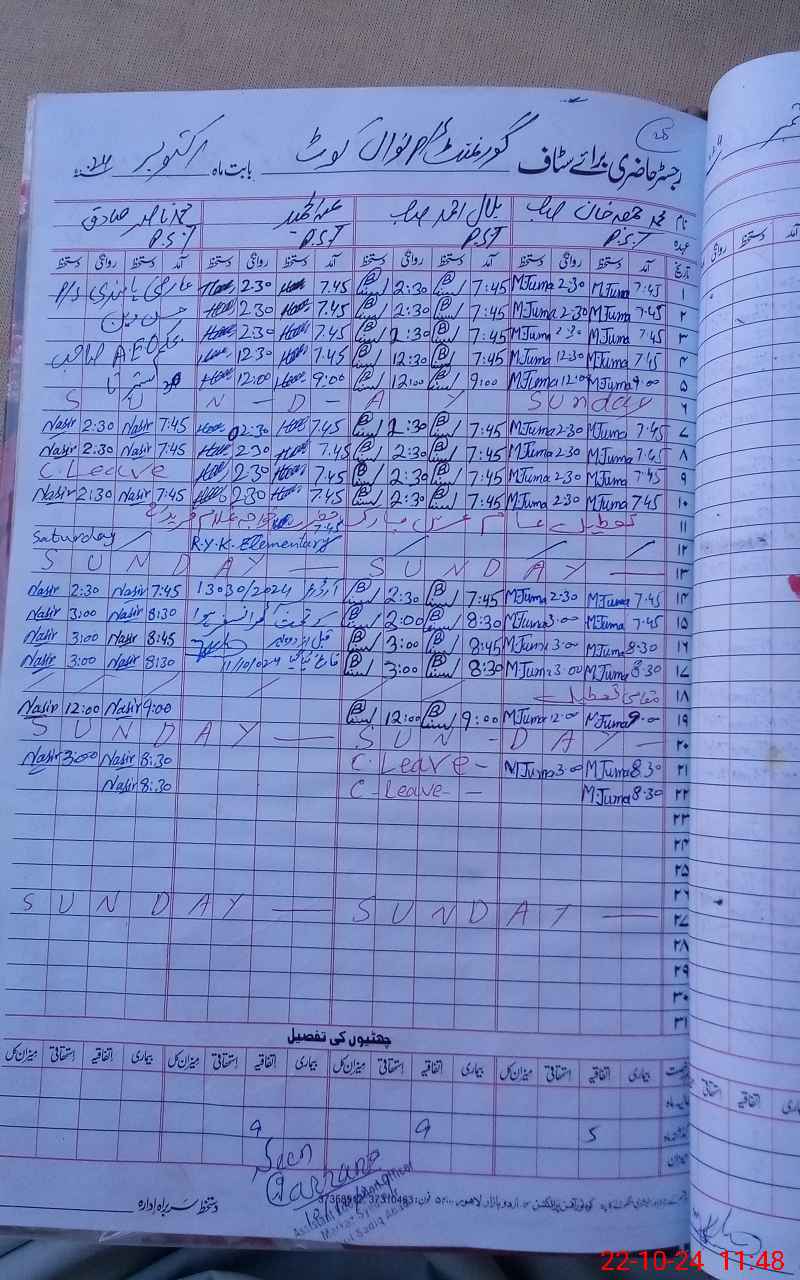 | CNIC | Full Name | Designation | R/C | Absence During Last Calender Month |