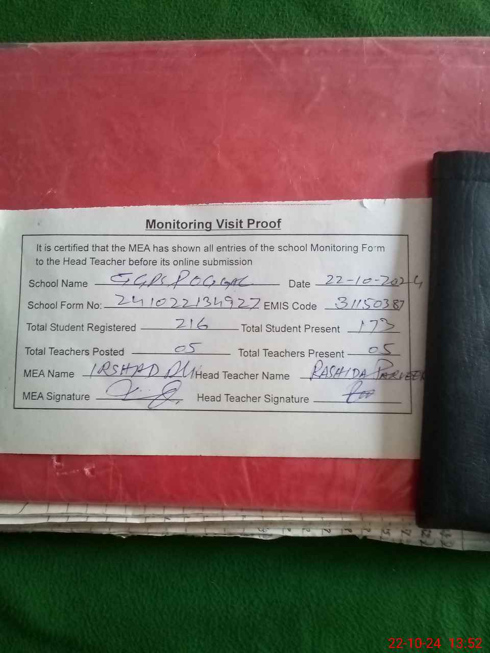 | Attendance Register | Head Teacher | MEA with School | Visit Proof |