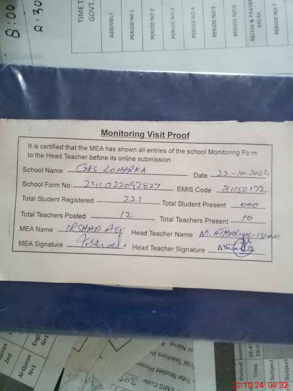 | Attendance Register | Head Teacher | MEA with School | Visit Proof |