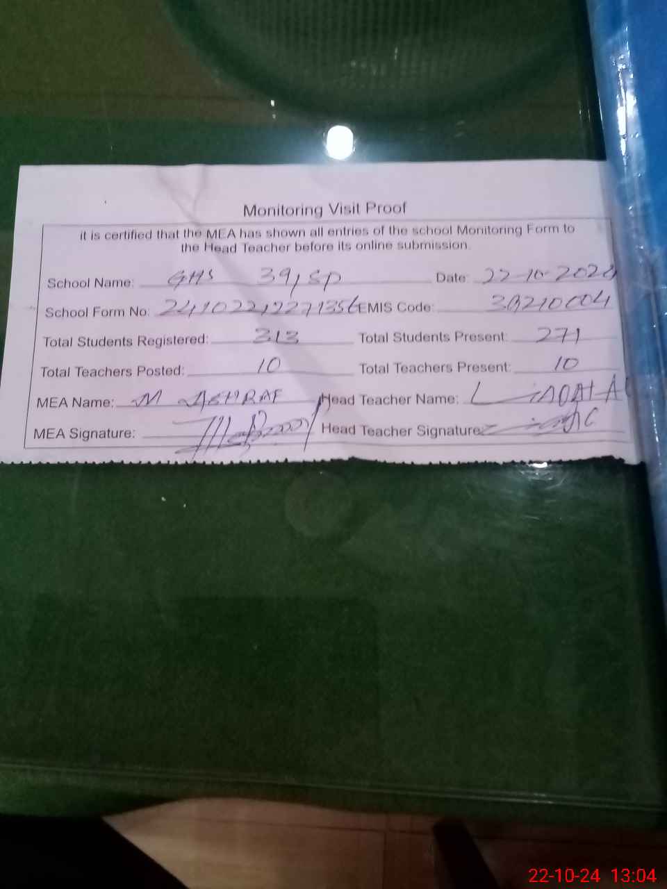 | EMIS Code: 39210004 | Name of School: GHS 39/S.P | |||