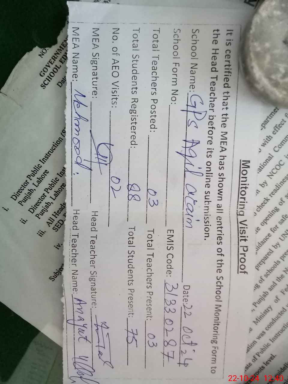 | Certified that this School was Inspected by the Undersigned MEA/DMO Today and the Information Stated Above is as Per Record. | |||||