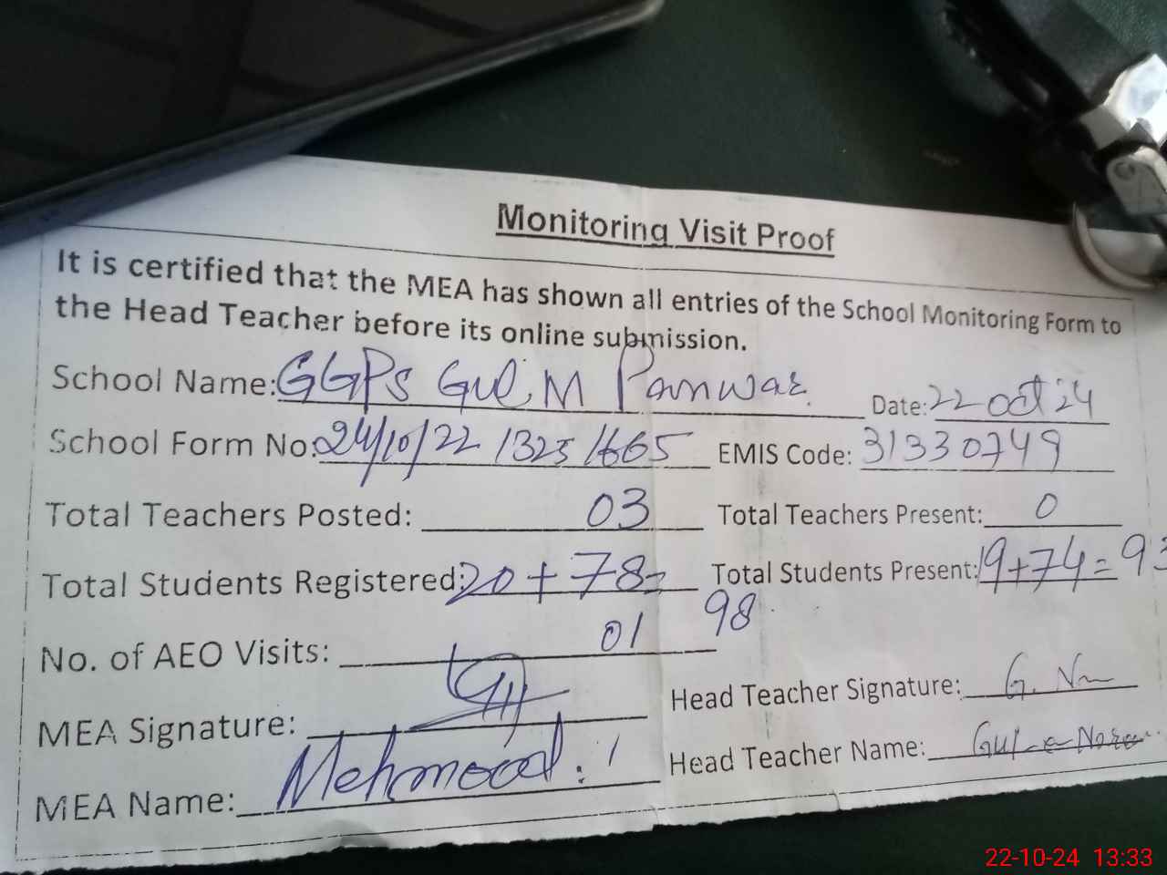 | Monitoring Date: 22-10-2024 | Start Time: 22-10-2024 12:55 PM | End Time: 22-10-2024 01:34 PM | Name of MEA: Ma**** UlHa**** | |