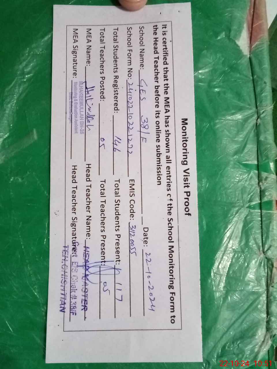 | Attendance Register | Head Teacher | MEA with School | Visit Proof |