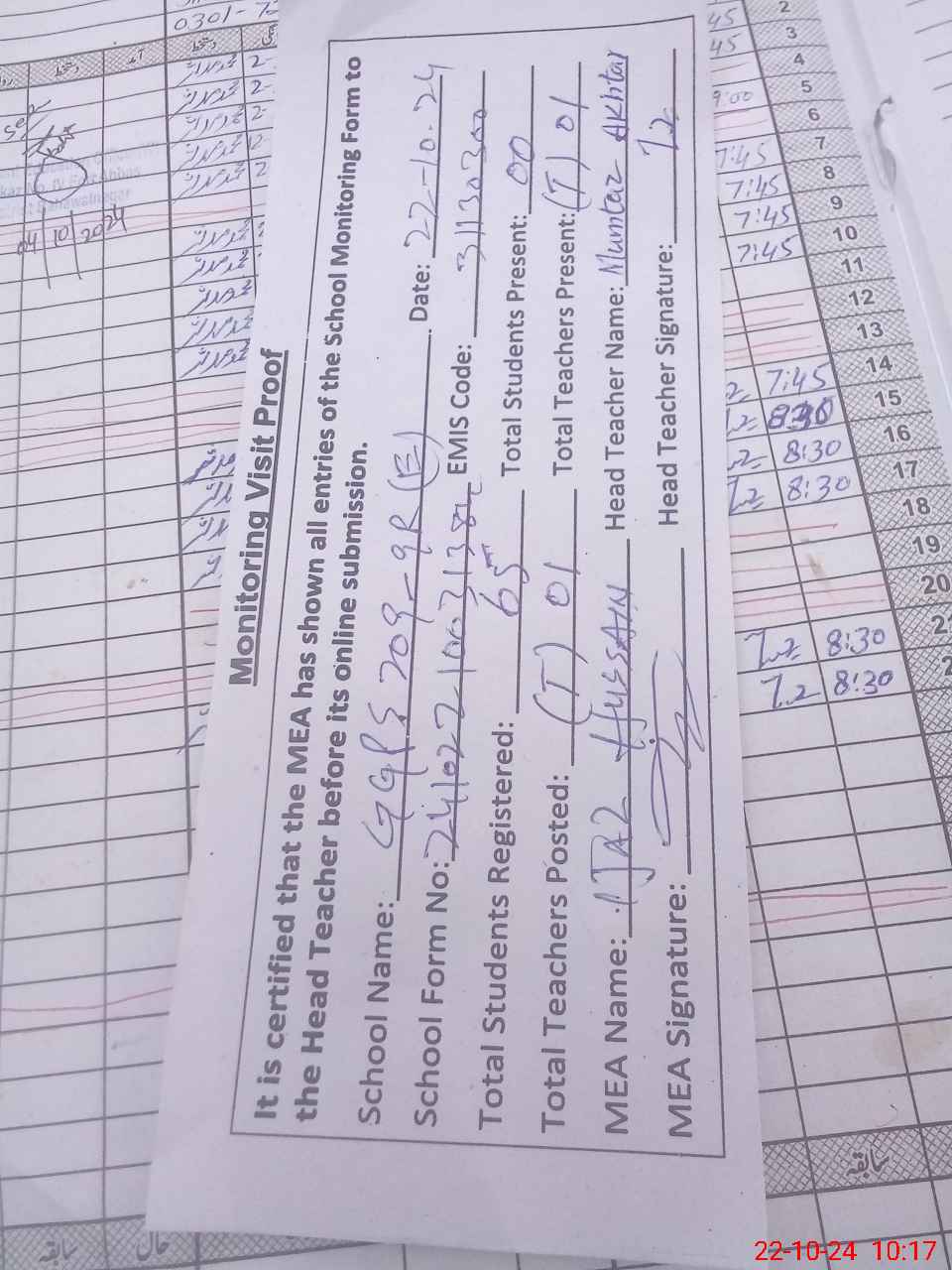 | Certified that this School was Inspected by the Undersigned MEA/DMO Today and the Information Stated Above is as Per Record. | |||||
