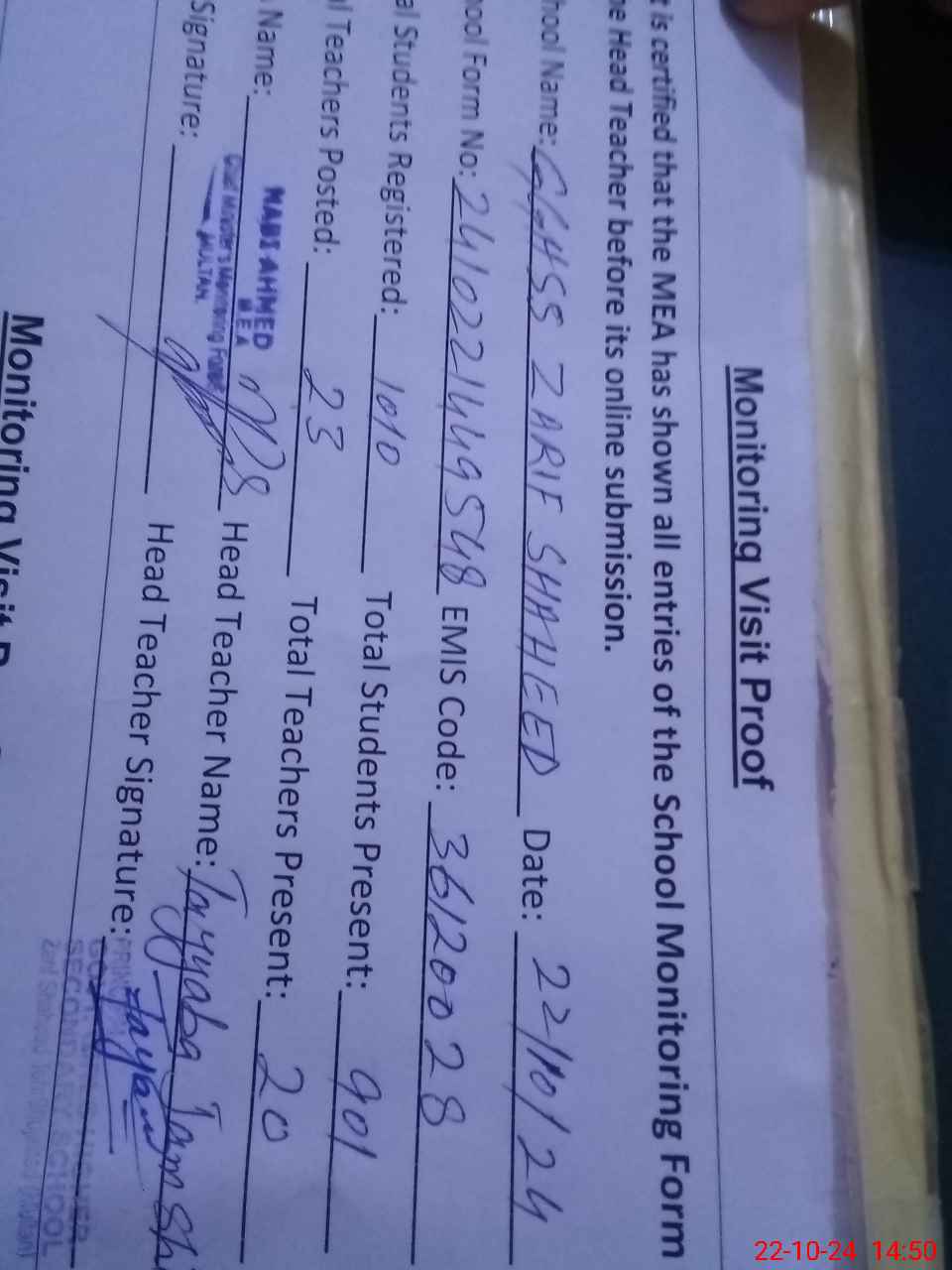 | Attendance Register | Head Teacher | MEA with School | Visit Proof |