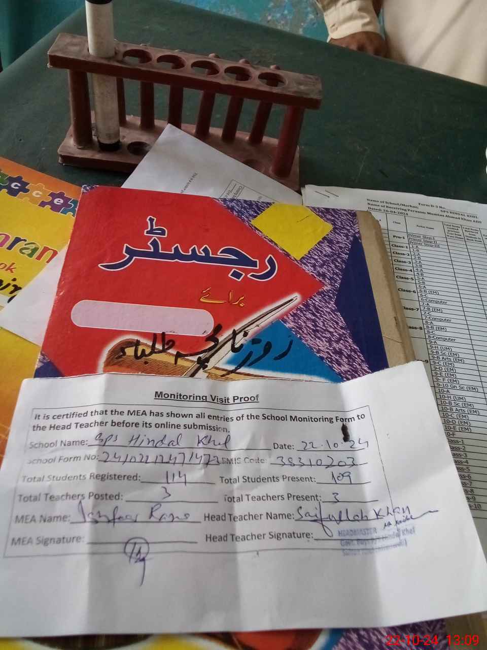 | Attendance Register | Head Teacher | MEA with School | Visit Proof |
