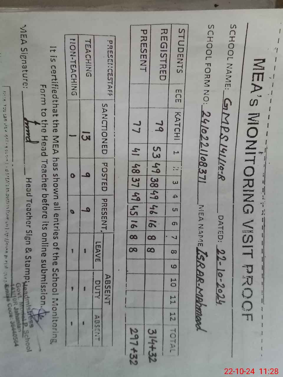 | Attendance Register | Head Teacher | MEA with School | Visit Proof |