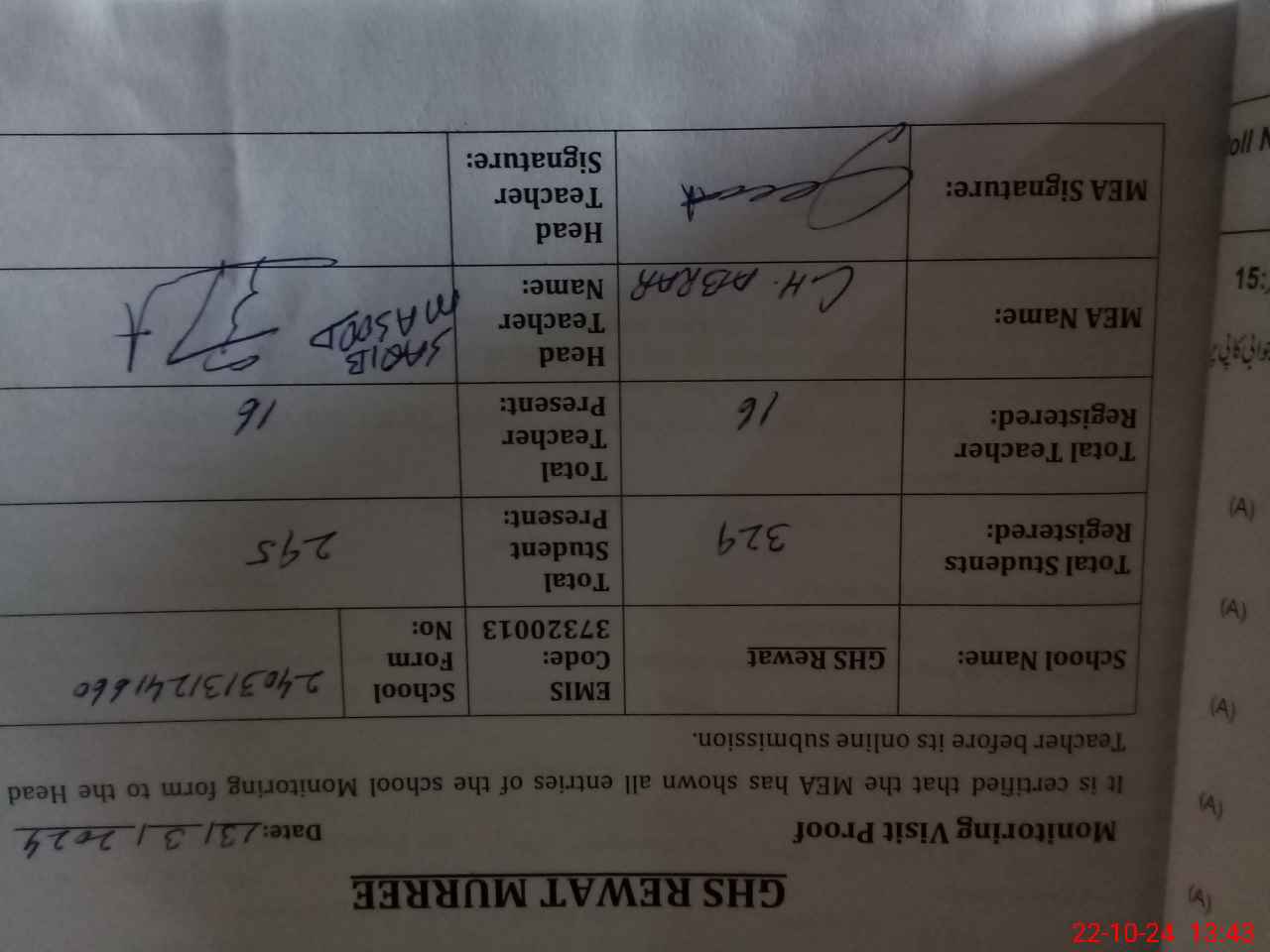 | Name: SA**** MA**** Designation: (School Headmaster's/Headmistress's) I C Hm Phone/Cell Number: 03**** |