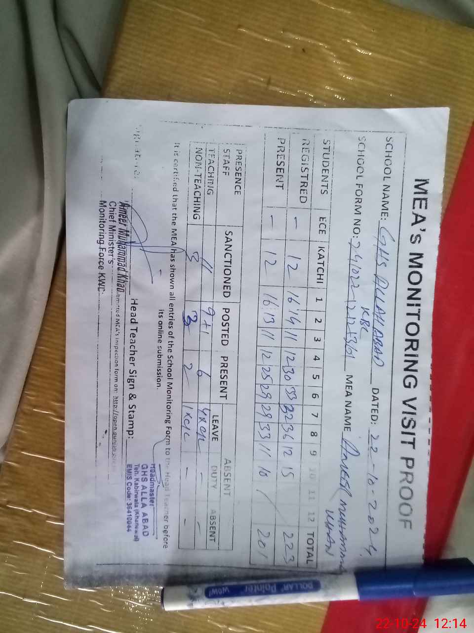 | Attendance Register | Head Teacher | MEA with School | Visit Proof |