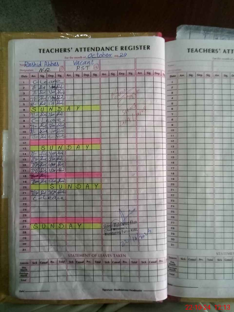 | CNIC | Full Name | Designation | R/C | Absence During Last Calender Month |