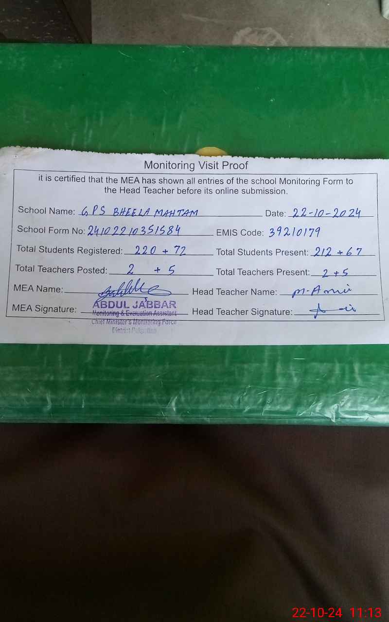 | EMIS Code: 39210179 | Name of School: GPS BHEELA MAHTAM | |||