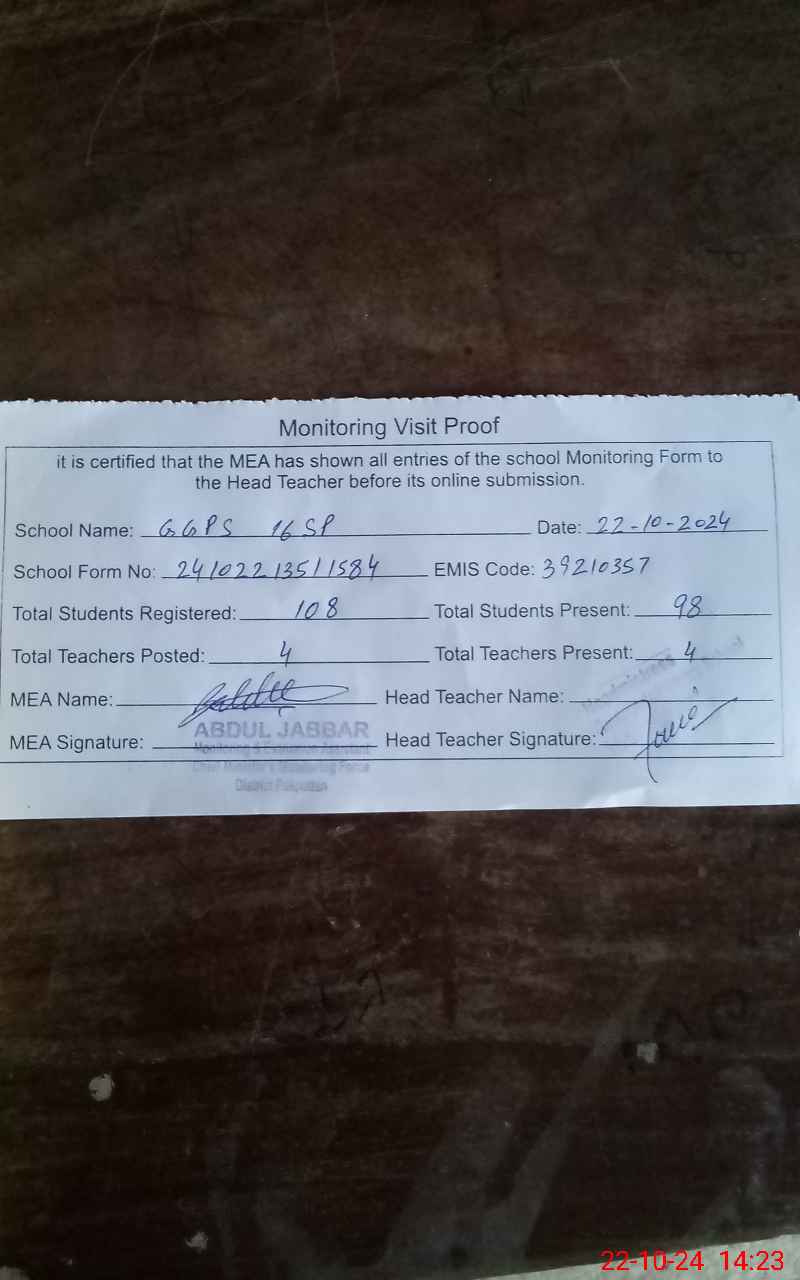 | EMIS Code: 39210357 | Name of School: GGPS 16 SP | |||