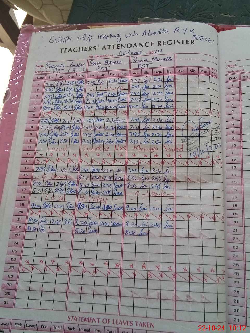 | Name: Sa**** Pa**** Designation: (School Headmaster's/Headmistress's) PST Phone/Cell Number: 03**** |