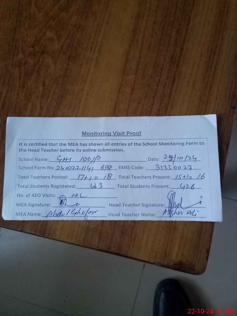 | Attendance Register | Head Teacher | MEA with School | Visit Proof |