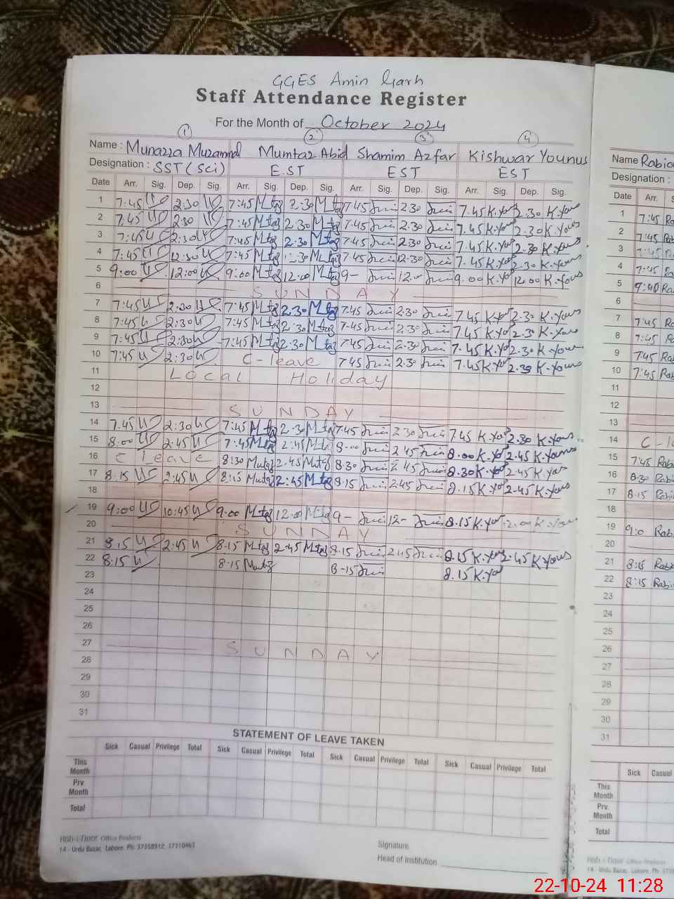 | Leave | Duty | Absent | Maternity | Medical | Ex- Pak |