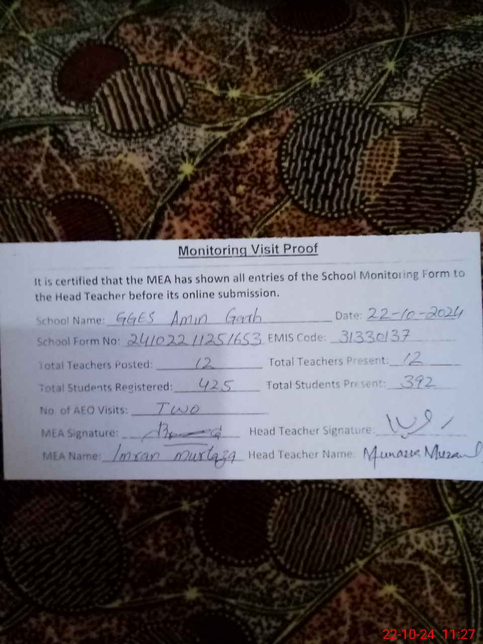 | Attendance Register | Head Teacher | MEA with School | Visit Proof |