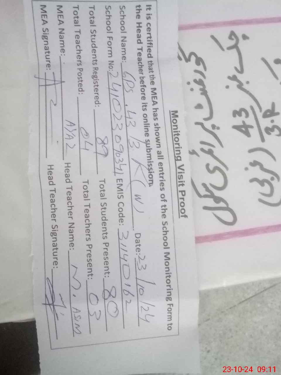 | EMIS Code: 31140162 | Name of School: GPS CHAK NO.43/3-R (W) | |||