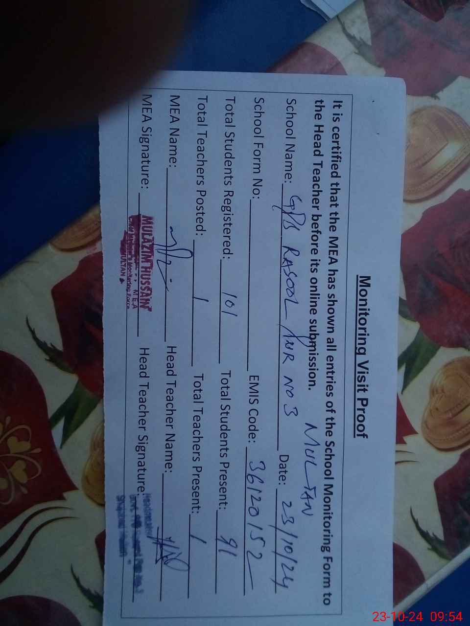 | EMIS Code: 36120152 | Name of School: GPS RASOOL PUR NO. 3 SHUJA ABAD | |||