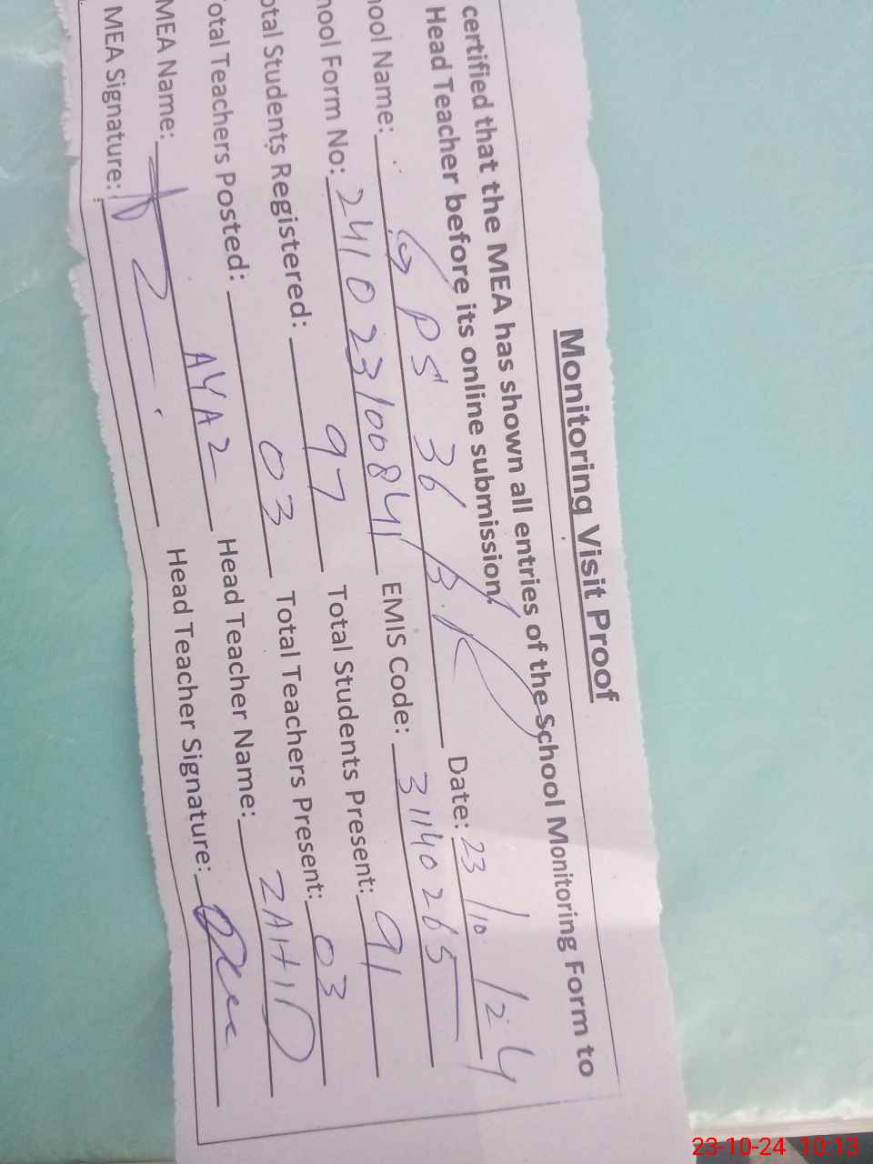 | Attendance Register | Head Teacher | MEA with School | Visit Proof |