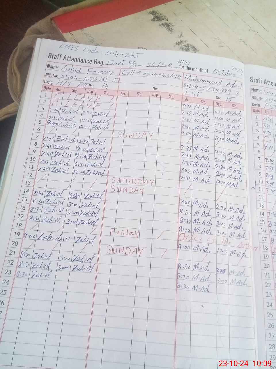 | Name: Za**** Fa**** Designation: (School Headmaster's/Headmistress's) PST Phone/Cell Number: 03**** |