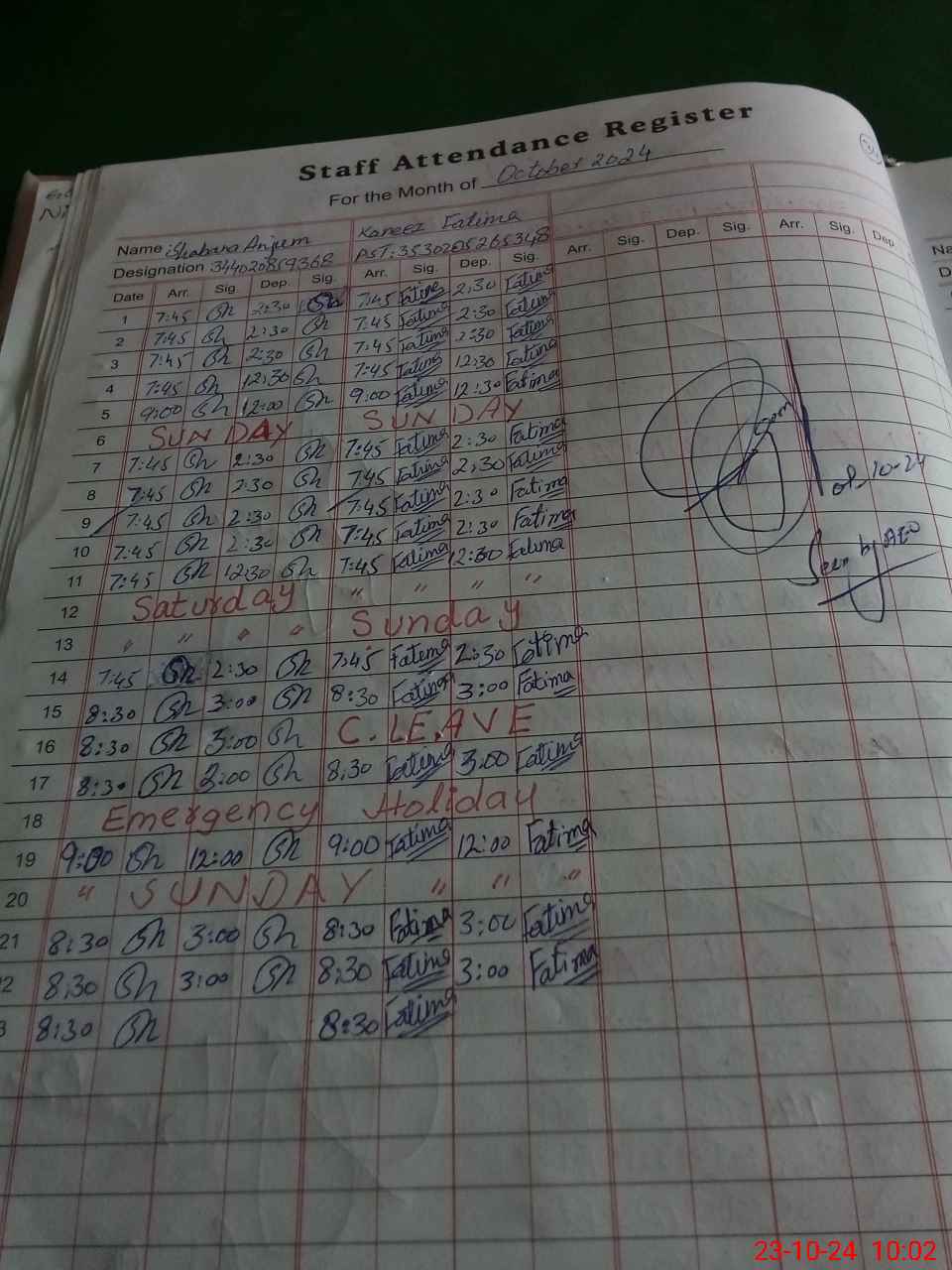 | CNIC | Full Name | Designation | R/C | Absence During Last Calender Month |
