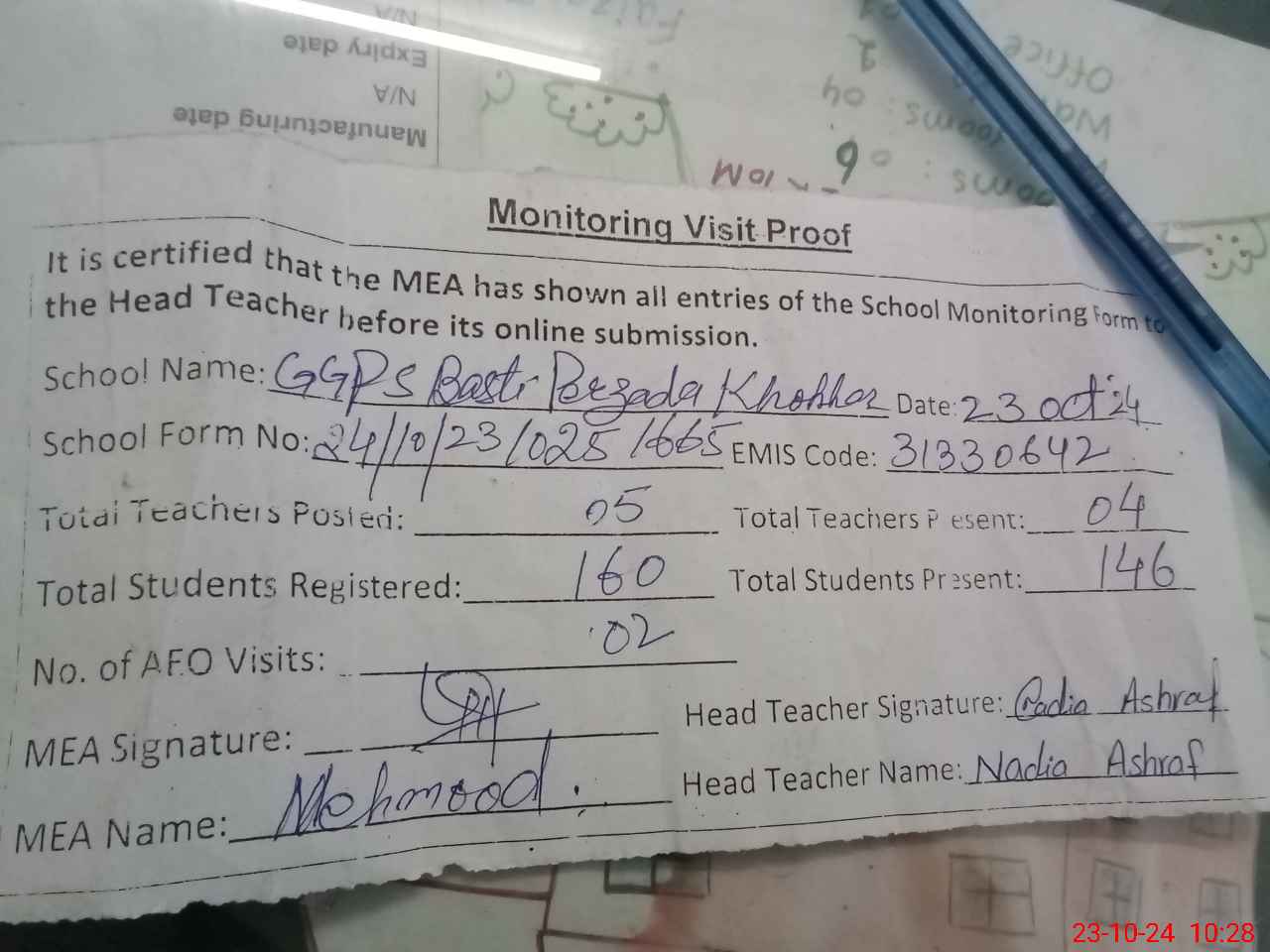| Monitoring Date: 23-10-2024 | Start Time: 23-10-2024 09:55 AM | End Time: 23-10-2024 10:28 AM | Name of MEA: Ma**** UlHa**** | |