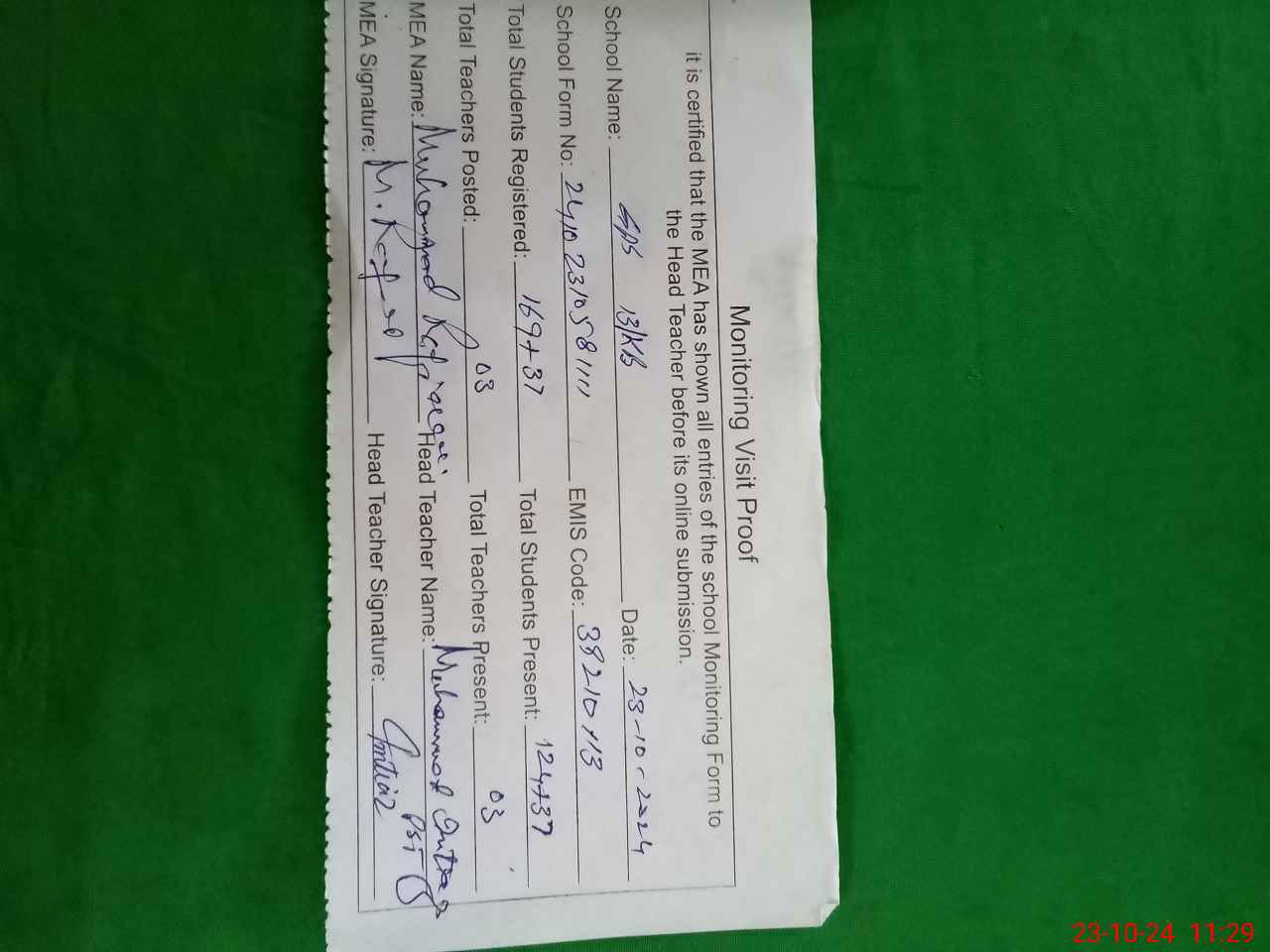 | Attendance Register | Head Teacher | MEA with School | Visit Proof |