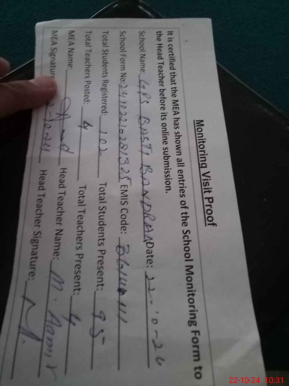 | Attendance Register | Head Teacher | MEA with School | Visit Proof |