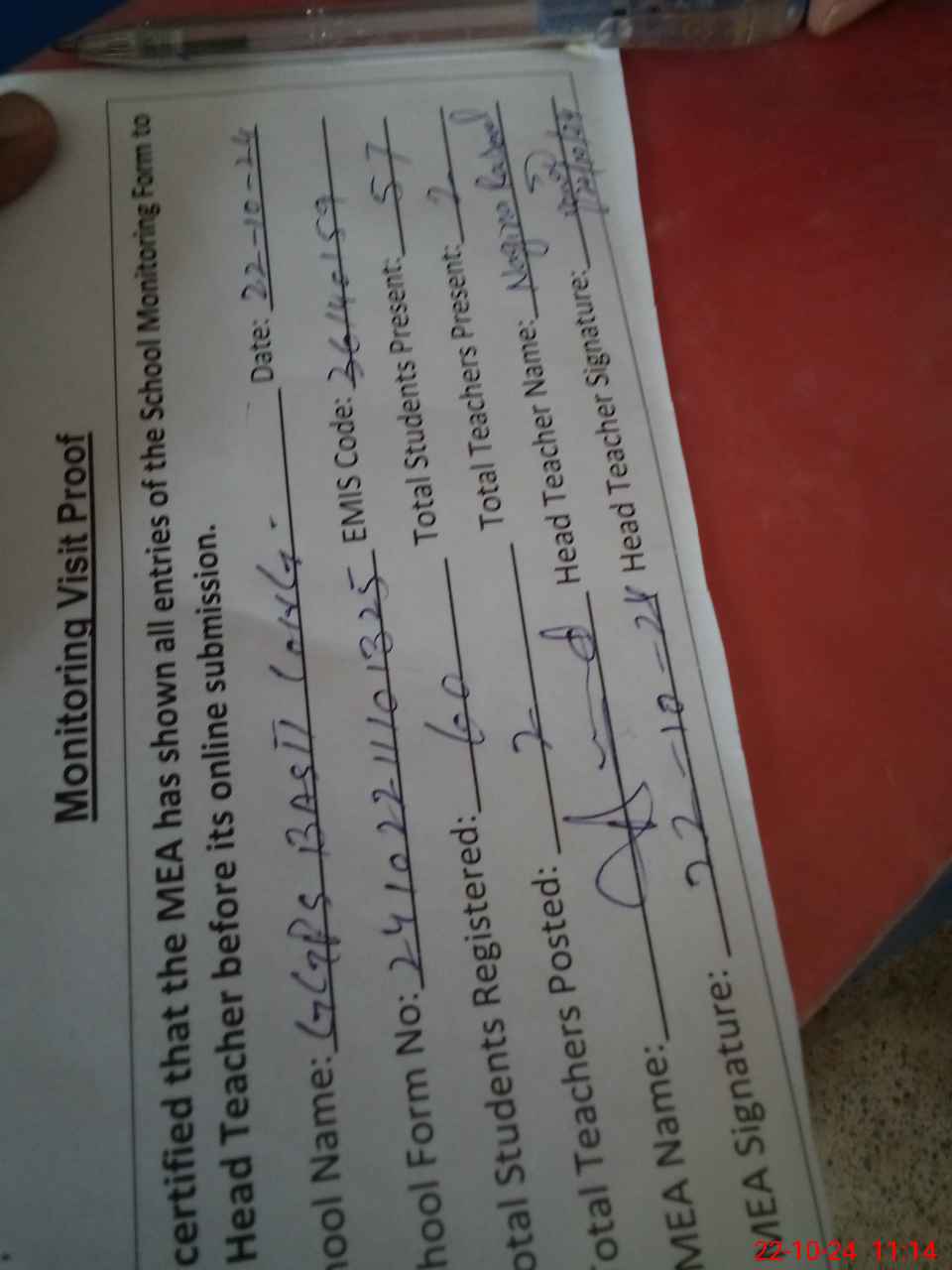 | Attendance Register | Head Teacher | MEA with School | Visit Proof |