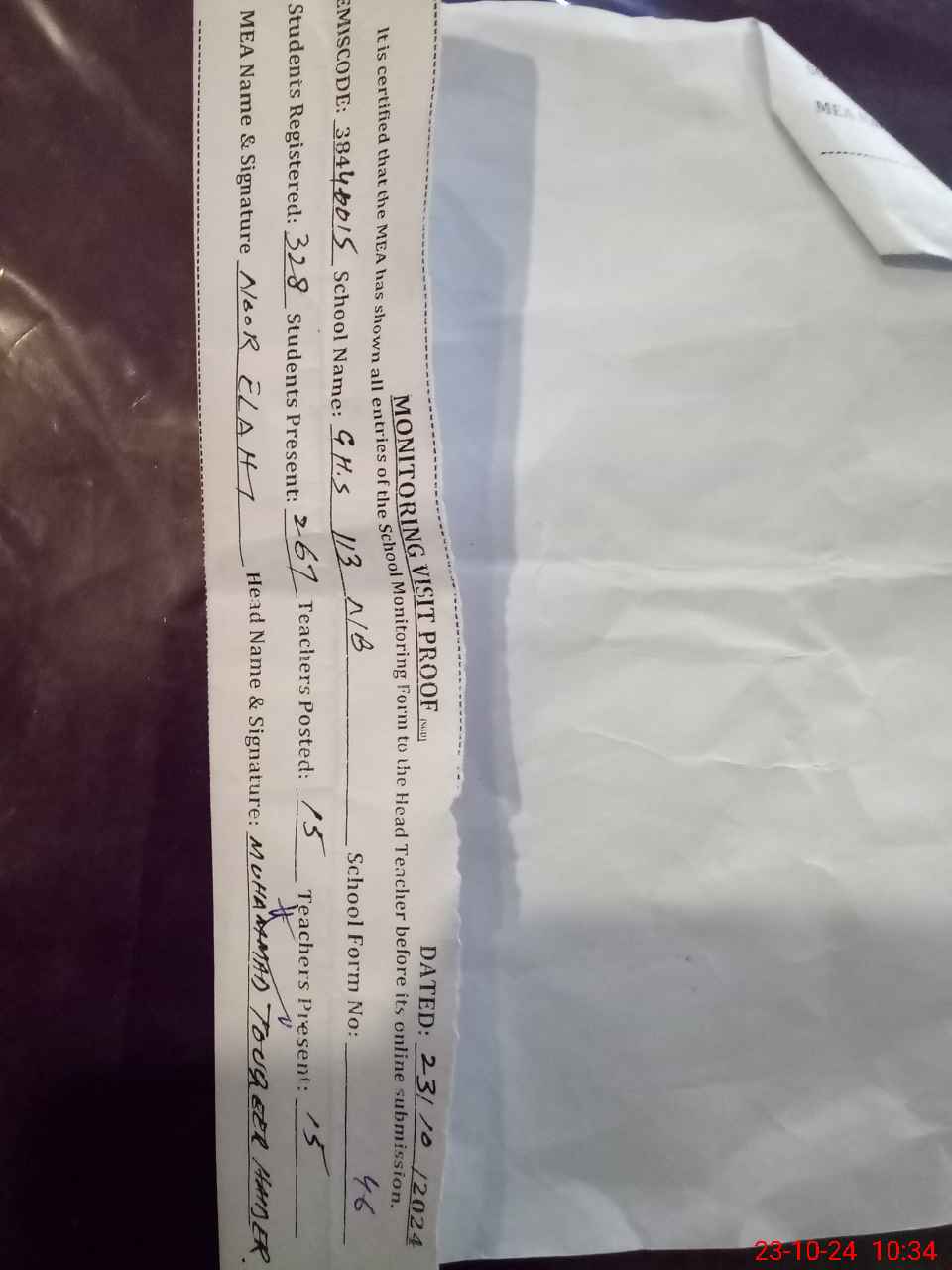 | Certified that this School was Inspected by the Undersigned MEA/DMO Today and the Information Stated Above is as Per Record. | |||||