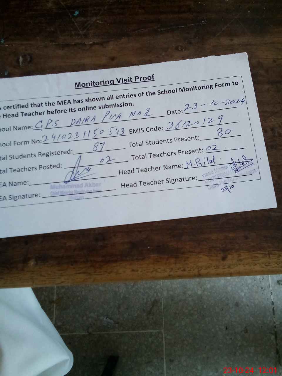 | Attendance Register | Head Teacher | MEA with School | Visit Proof |