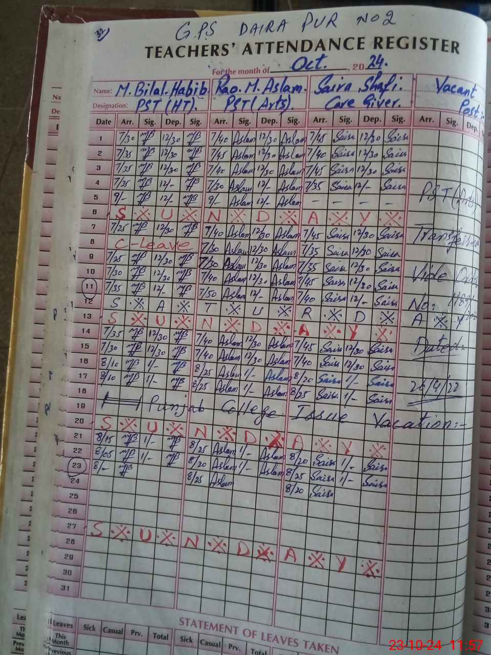 | CNIC | Full Name | Designation | R/C | Absence During Last Calender Month |
