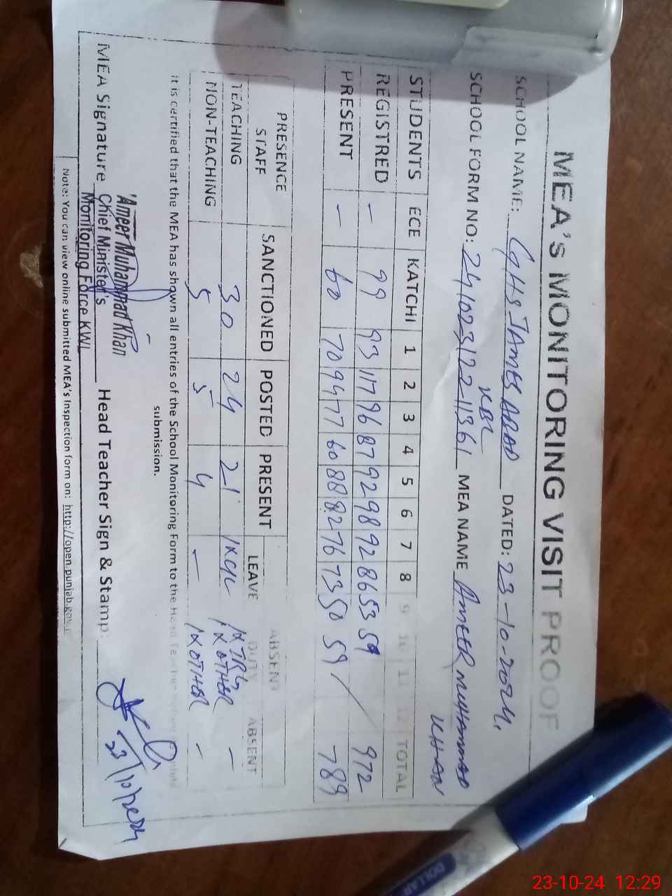 | Attendance Register | Head Teacher | MEA with School | Visit Proof |
