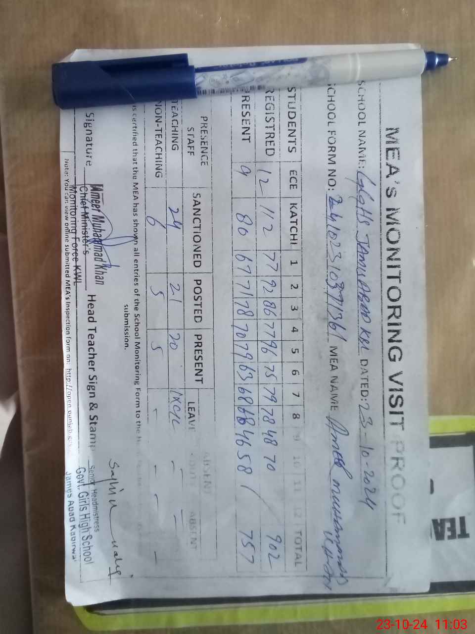 | Attendance Register | Head Teacher | MEA with School | Visit Proof |