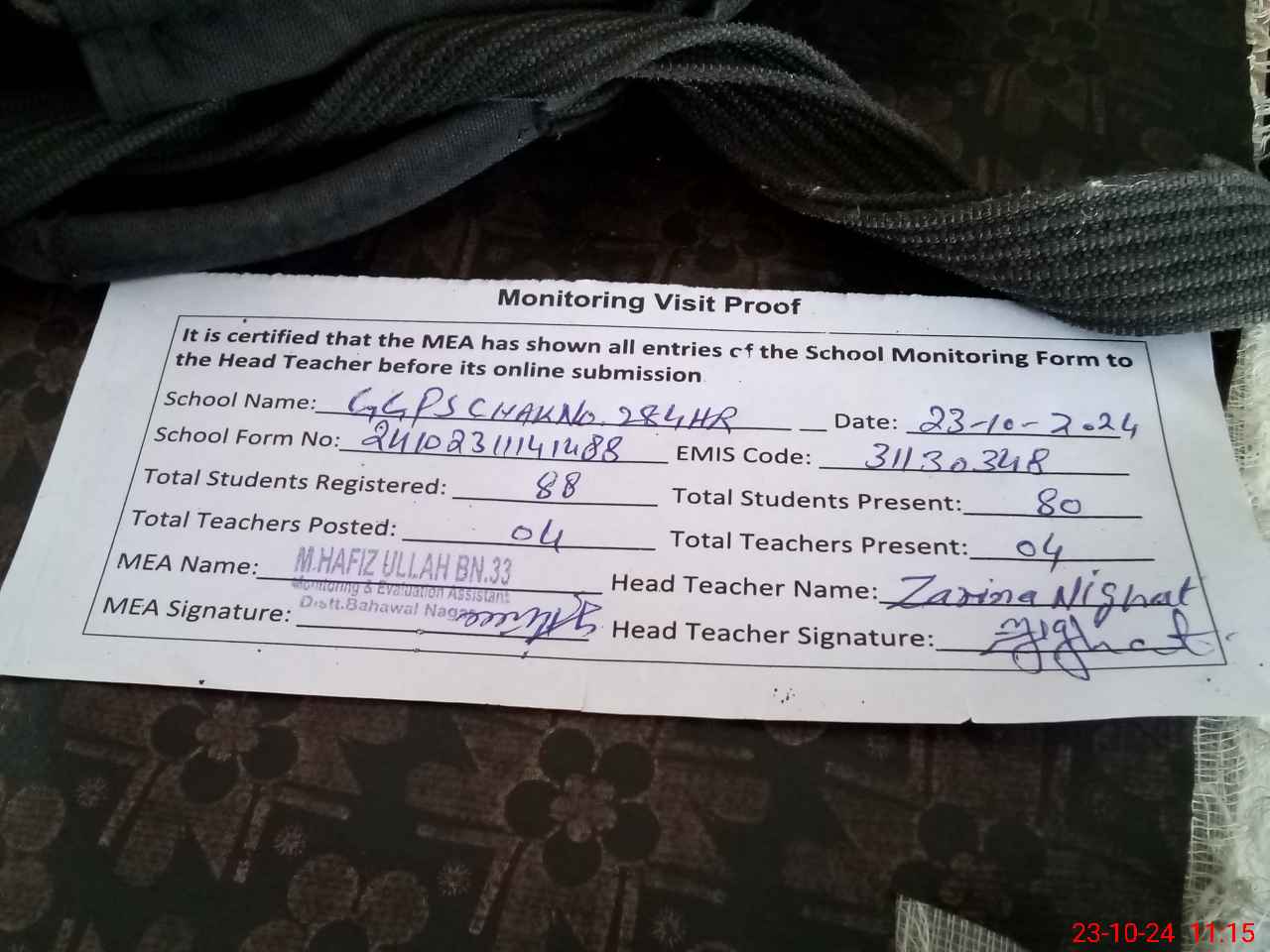 | Name: Za**** Ni**** Designation: (School Headmaster's/Headmistress's) EST Phone/Cell Number: 03**** |