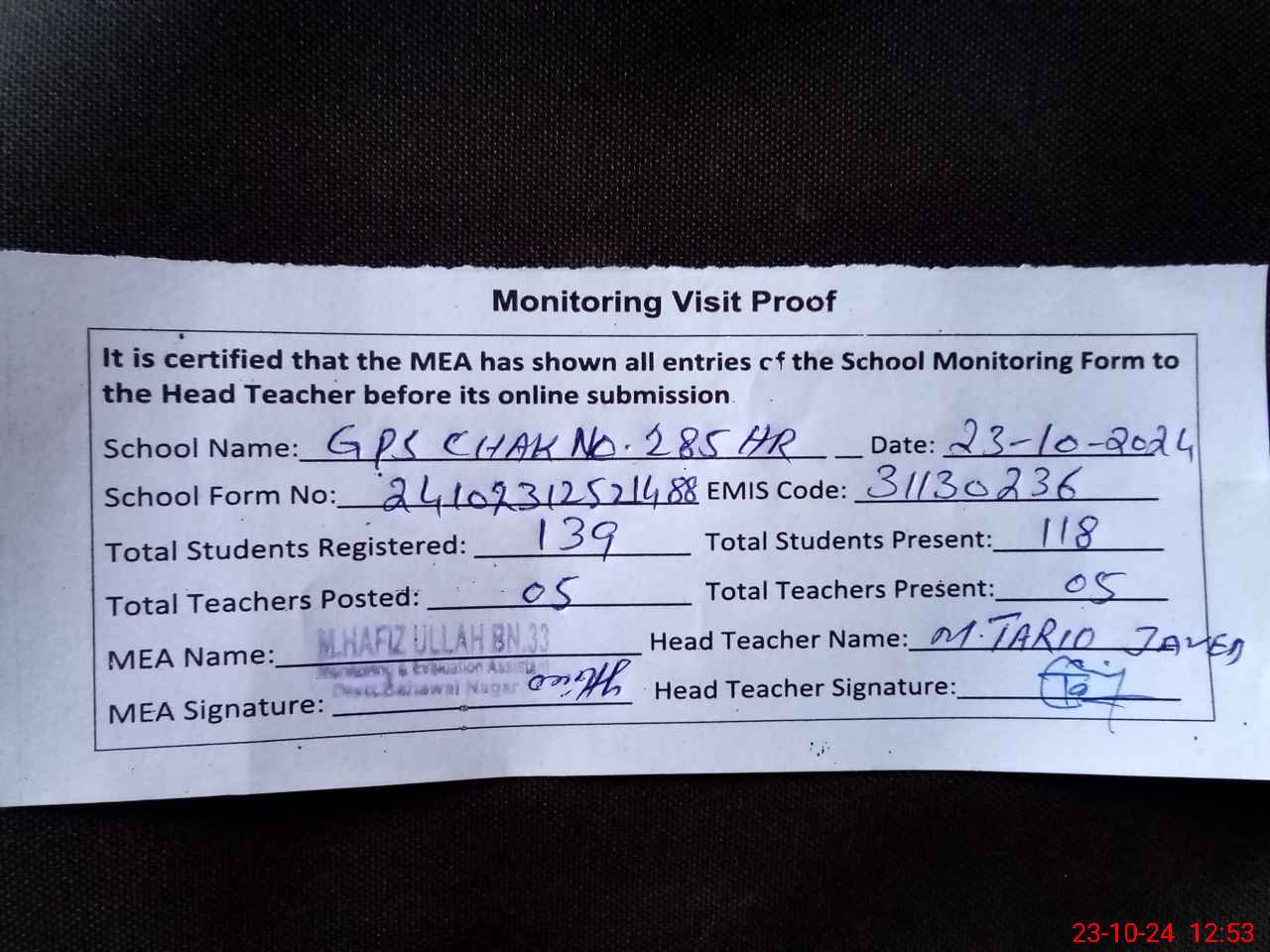 | EMIS Code: 31130236 | Name of School: GPS CHAK NO 285 HR | |||