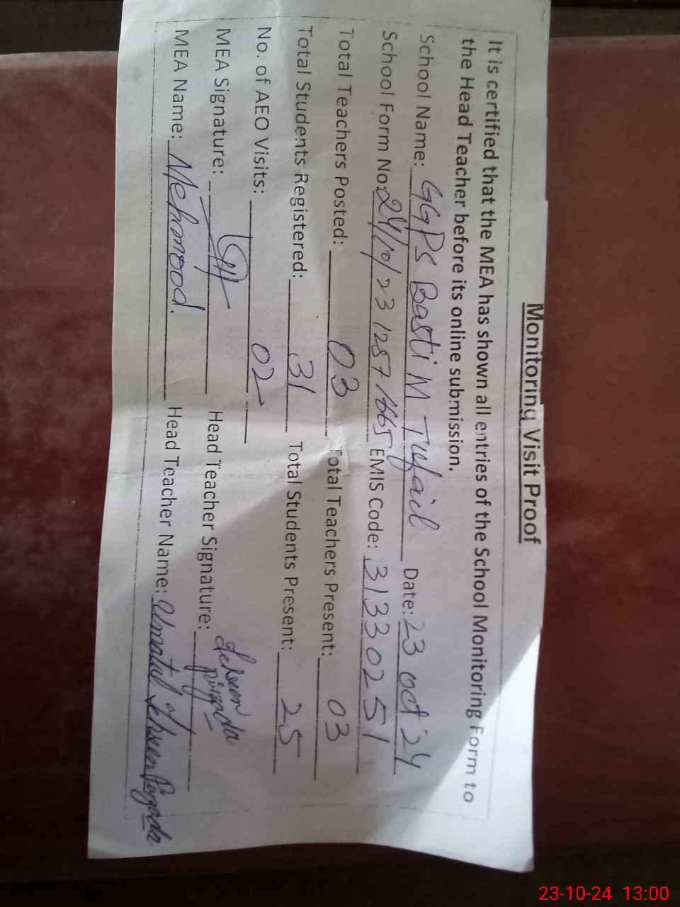 | Attendance Register | Head Teacher | MEA with School | Visit Proof |