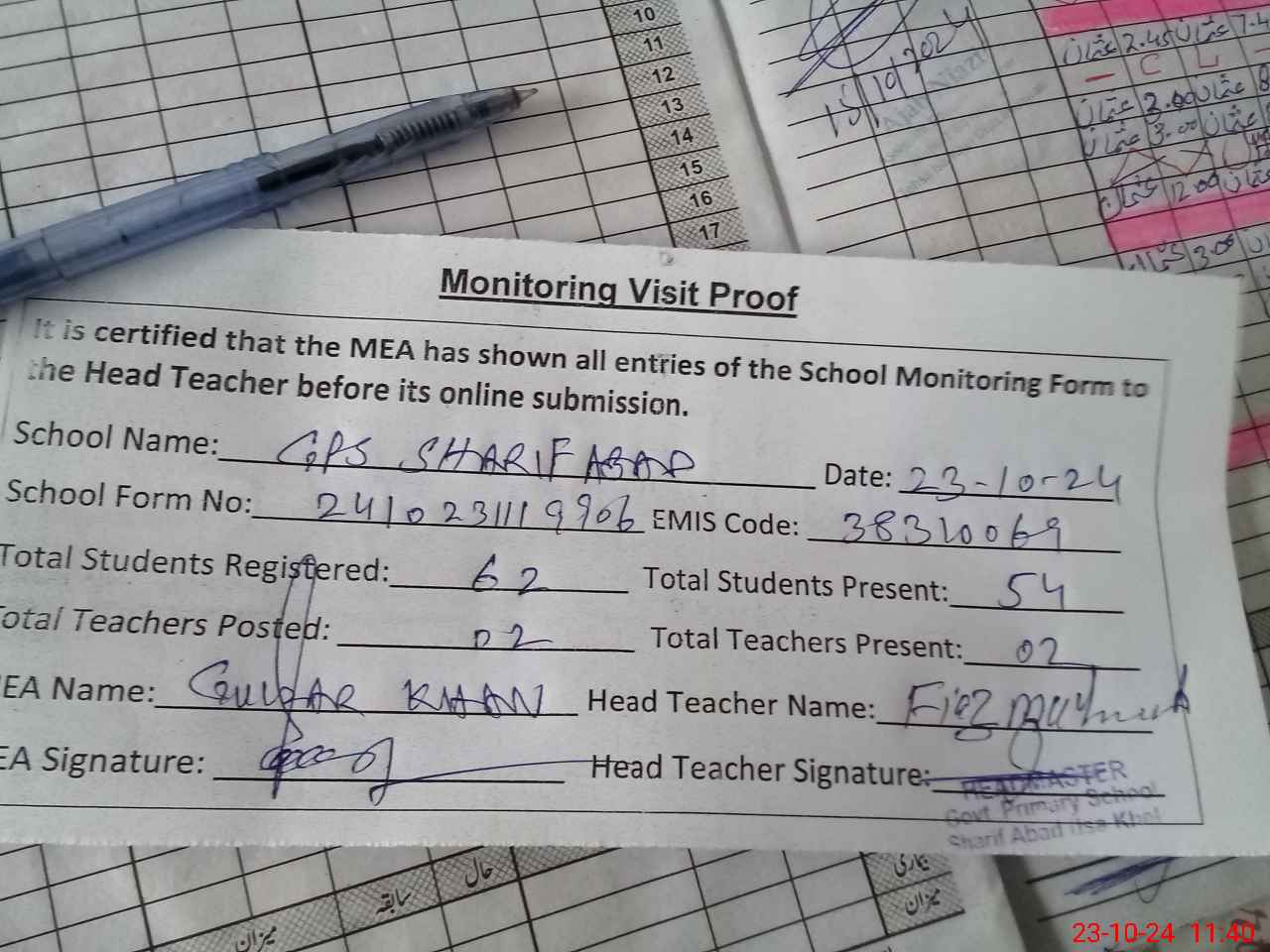 | Attendance Register | Head Teacher | MEA with School | Visit Proof |