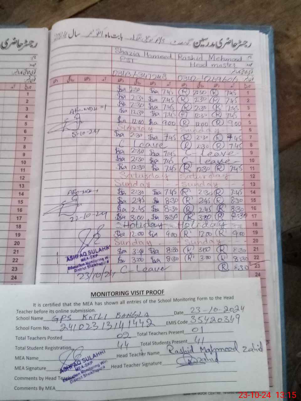 | Attendance Register | Head Teacher | MEA with School | Visit Proof |