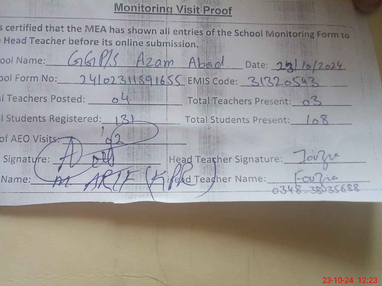 | EMIS Code: 31320543 | Name of School: GGPS AZAM ABAD | |||