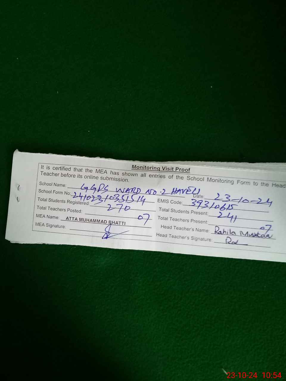 | Certified that this School was Inspected by the Undersigned MEA/DMO Today and the Information Stated Above is as Per Record. | |||||