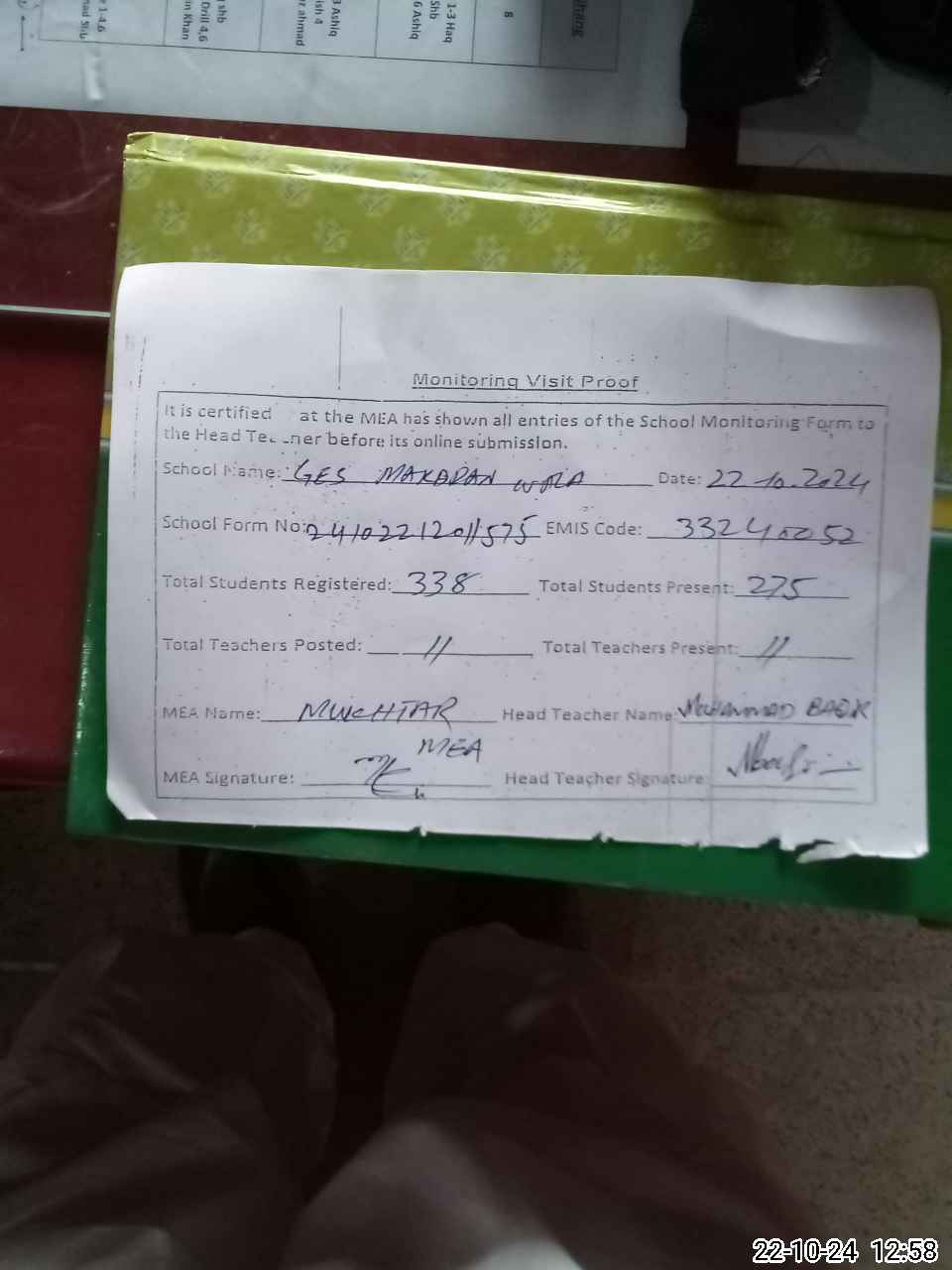 | Attendance Register | Head Teacher | MEA with School | Visit Proof |