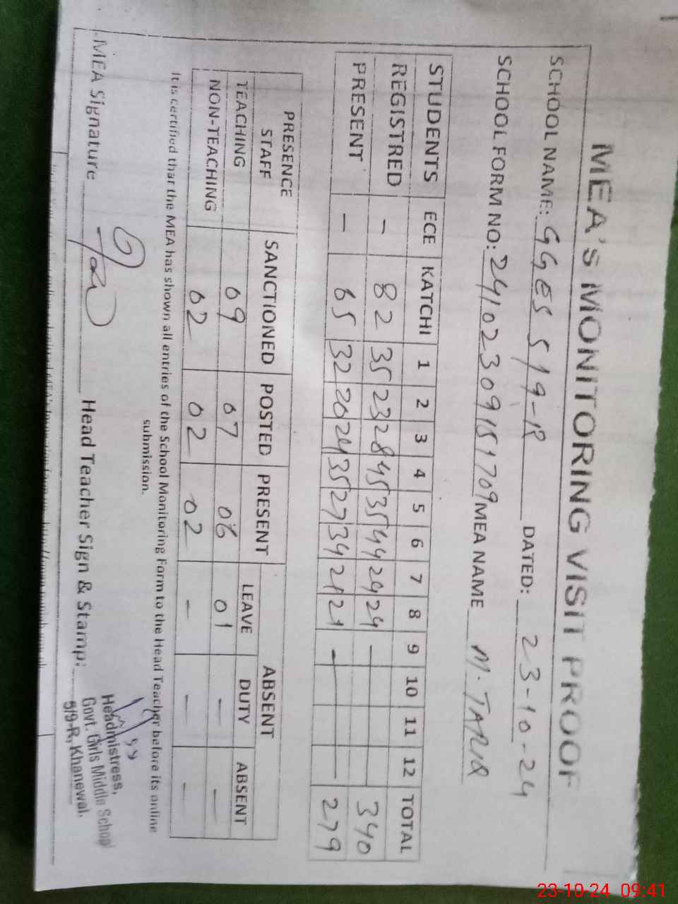 | Attendance Register | Head Teacher | MEA with School | Visit Proof |